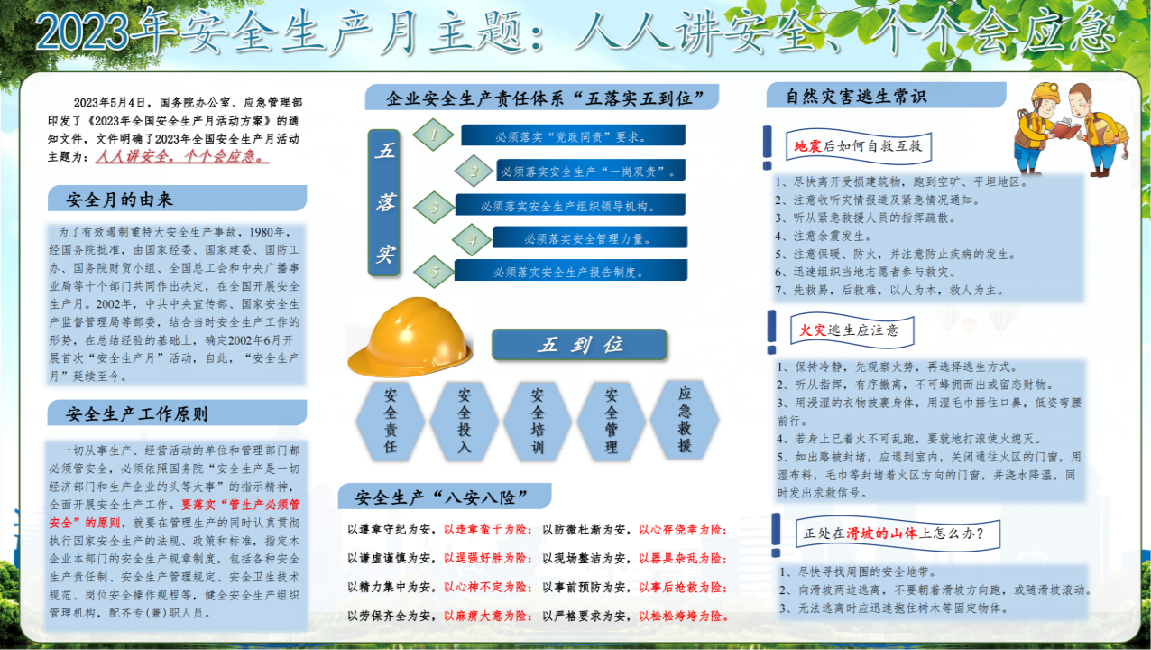 今年6月是全國第22個“安全生產(chǎn)月”,為深入貫徹落實(shí)習(xí)近平總書記關(guān)于安全生產(chǎn)重要論述精神,持續(xù)深化“意識+責(zé)任+標(biāo)準(zhǔn)化”安全管理體系,大力傳播安全理念、弘揚(yáng)安全文化,扎實(shí)開展好“安全生產(chǎn)月”活動,引導(dǎo)廣大干部職工進(jìn)一步增強(qiáng)安全意識、責(zé)任意識、紅線意識、標(biāo)準(zhǔn)意識,不斷夯實(shí)安全基礎(chǔ),公司從多角度、多形式開展安全教育活動,全面提升員工的安全防范意識。